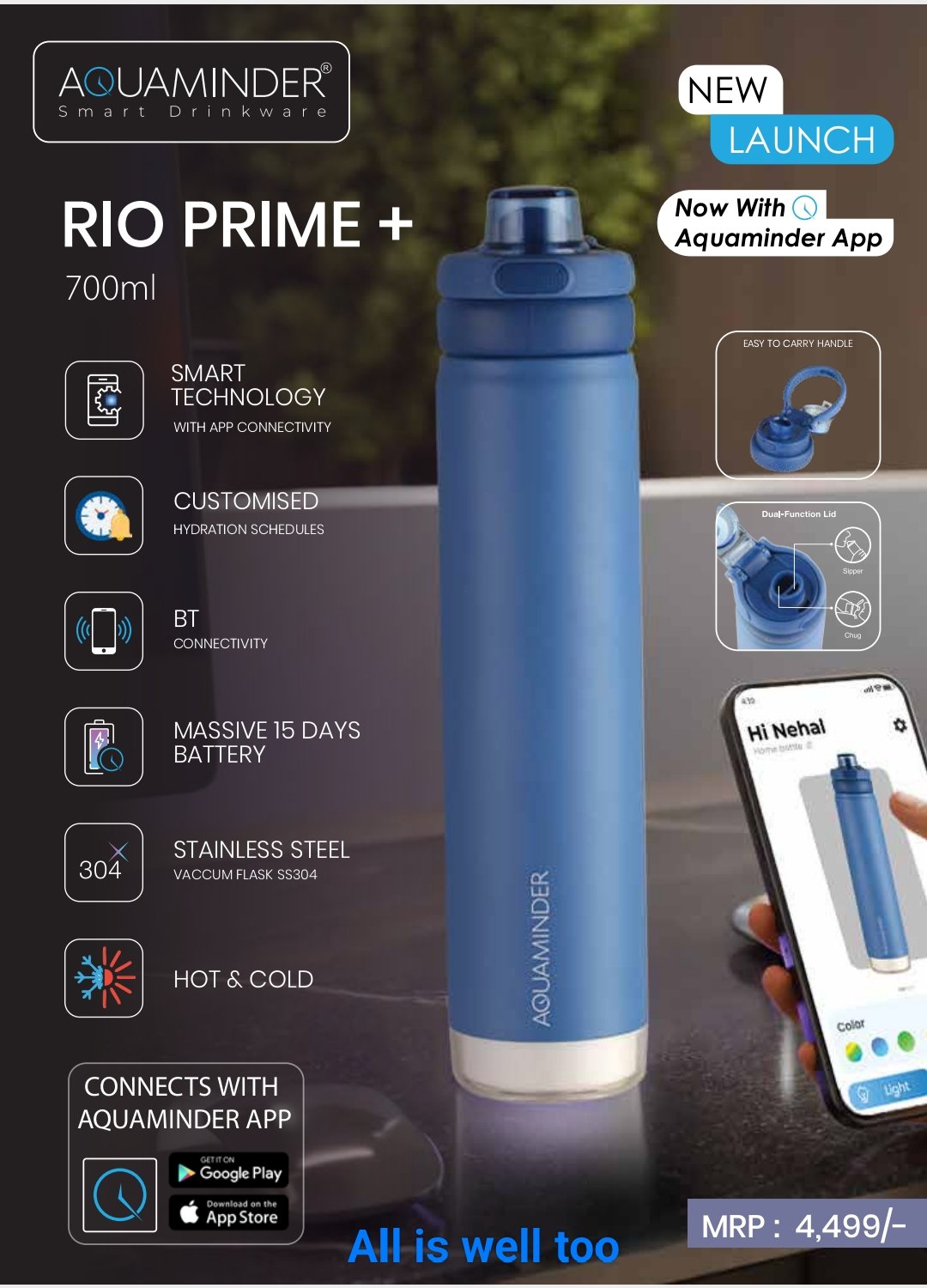 Total Connectivity: Syncs via BT (Bluetooth) to the Aquaminder App for customized hydration schedules and smart alerts.